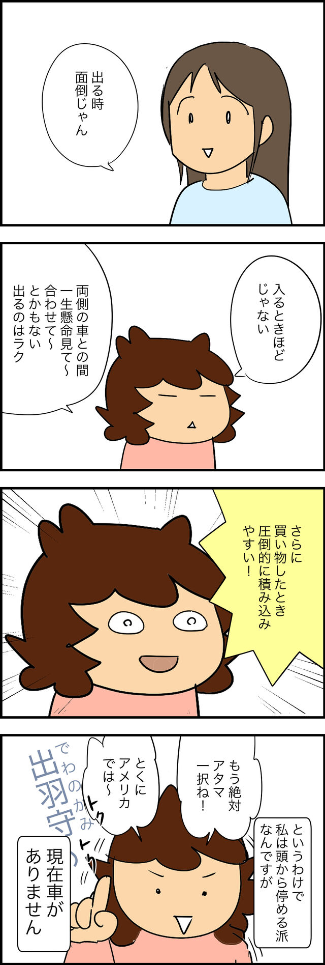 今はどの車にもカメラついているから、昔よりかは停めやすいですが、やっぱり狭いから出る時の安全策優先にしちゃうのかな。