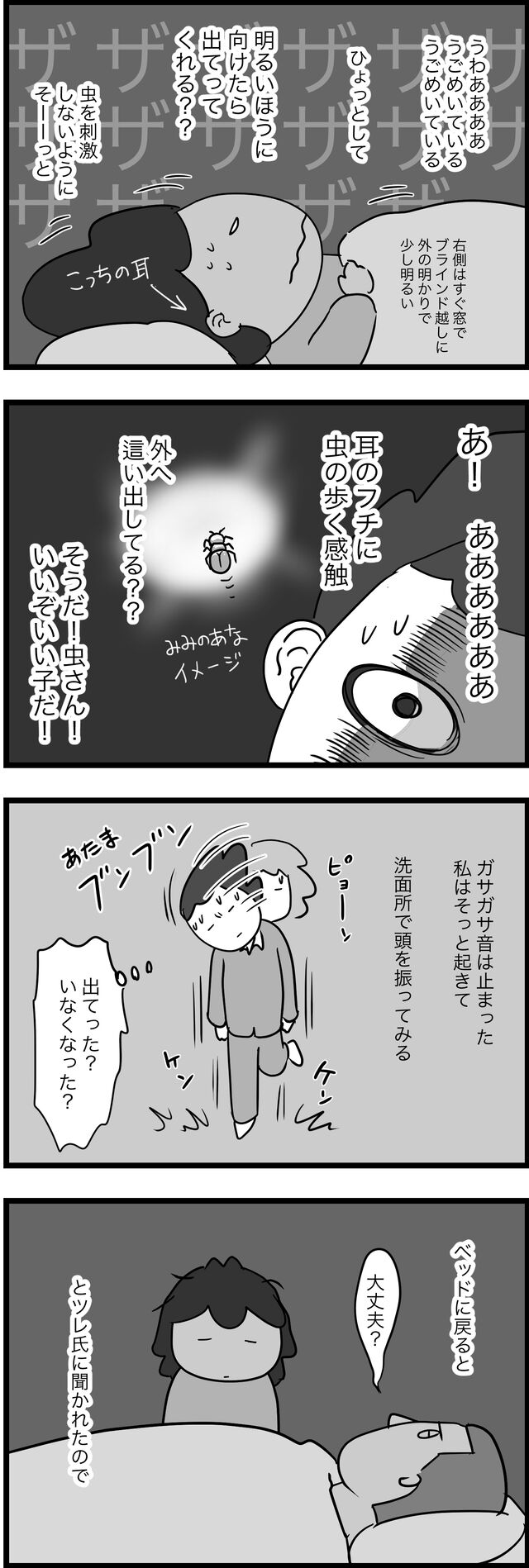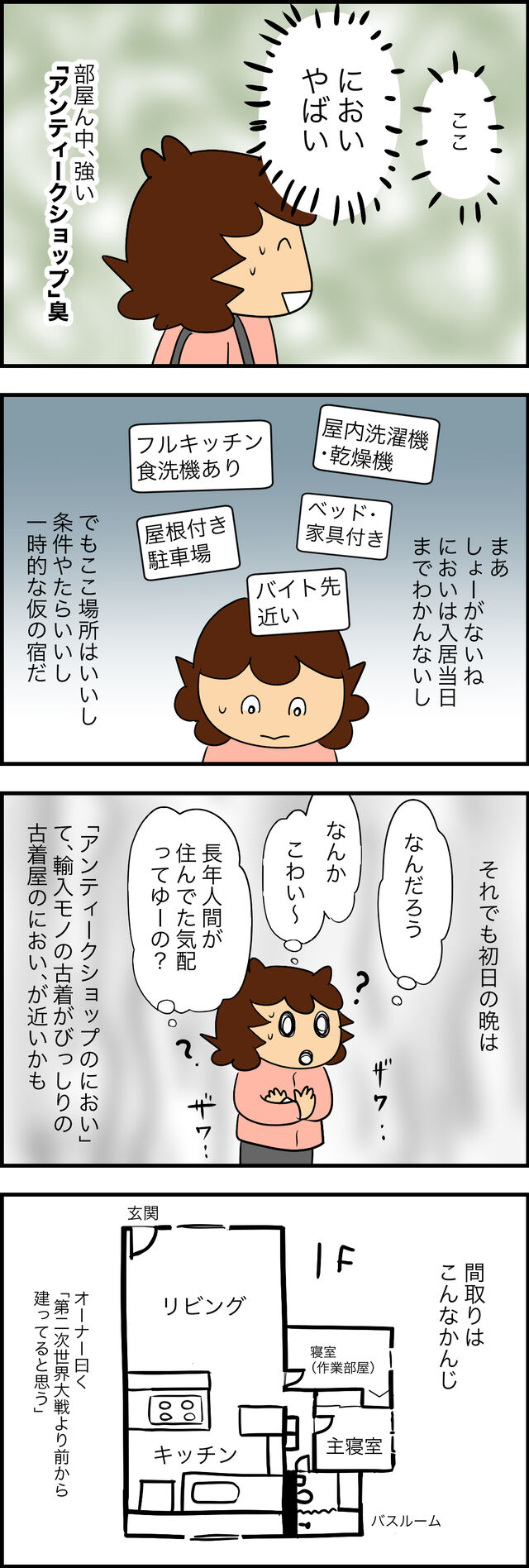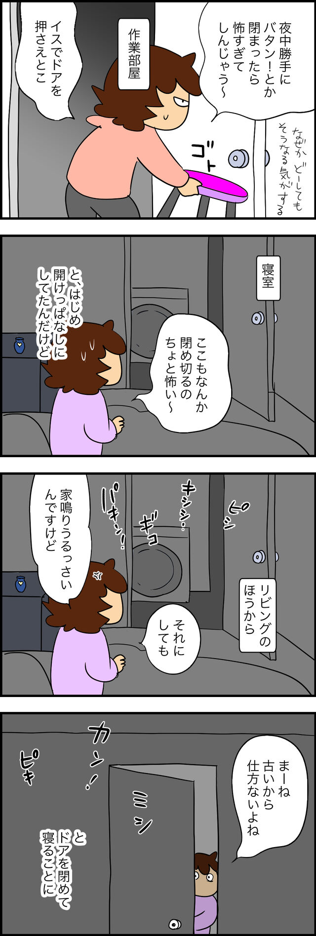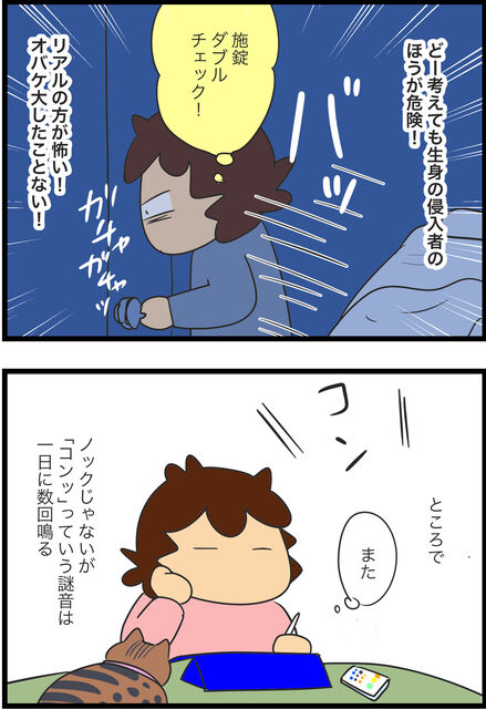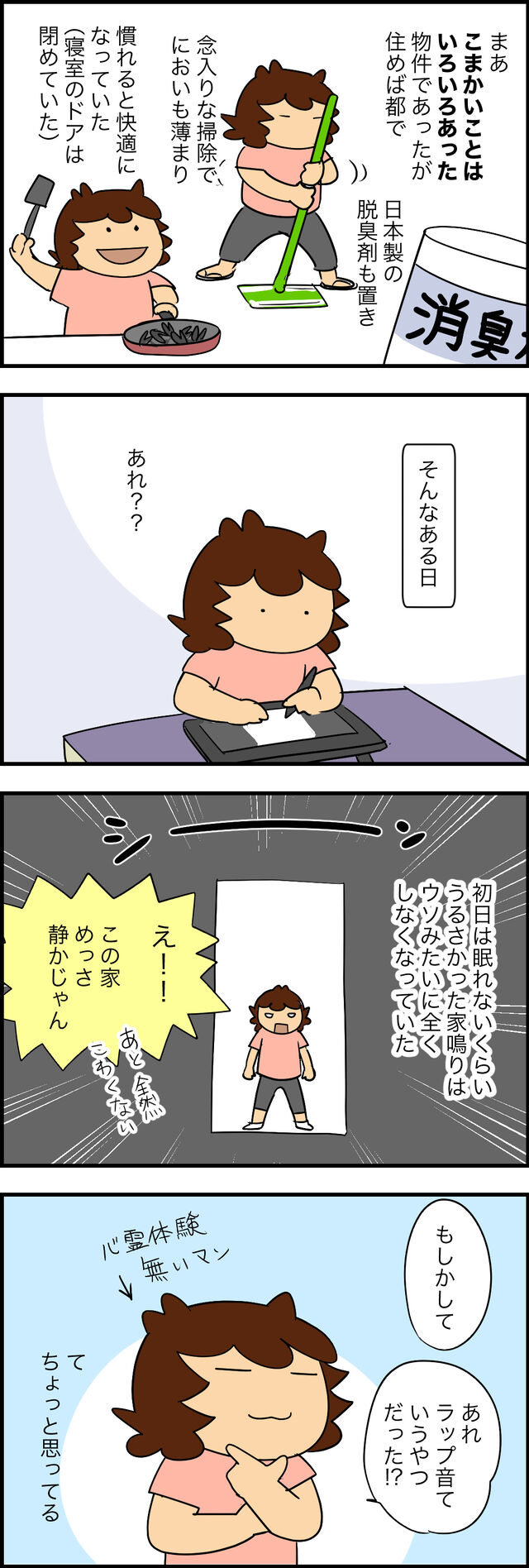 ツレ氏の家から飛び出したあとの暮らしのエピソードを順不同にマンガに起こします。このアパートは私以外少なくとも他に4人入居者がいたが、それらの生活音とはまったく違う「家鳴り」。普通に木造建築が立てそうな物音だったので「古い家の家鳴りってこんなやかましいのか… ...